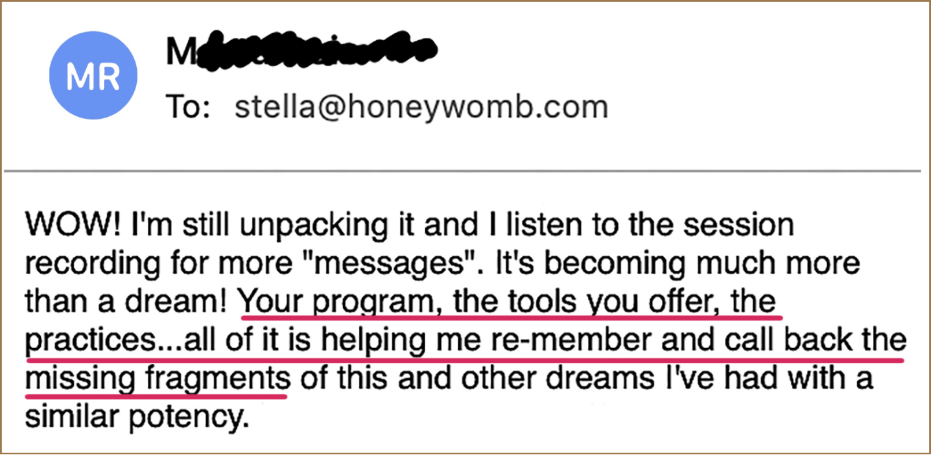 “Participating in dream-weaving sessions with a small circle of women has profoundly enriched my waking life and creative expression in a remarkably short period. Stella's unique approach to weaving dreams into reality has opened my eyes to new ways of contributing to and elevating human consciousness and well-being. The practices of Recalling, Weaving, Mirroring, and Returning to Wholeness, have magically created the sense of being rooted and grounded. I now take action in my waking life more confidently and creatively. Her program introduces a variety of impactful practices, but the one that continues to resonate profoundly with me is the art of weaving and mirroring. The ritual of inviting the wisdom of the bees, the hive, the Melissae, the womb of the world, into my dreams became a nightly beacon of guidance, healing, and empowerment. Now living in Portugal for 7 months, on my ancestors’ land, my dreams have revealed a profound connection to the Earth and its cycles, embodying the nurturing spirit of Mother Nature herself. I am immensely grateful for the journey Stella has guided me on, and I wholeheartedly recommend her Honeywomb programs to anyone seeking to explore the depths of their dreams and the heights of their creative potential.”